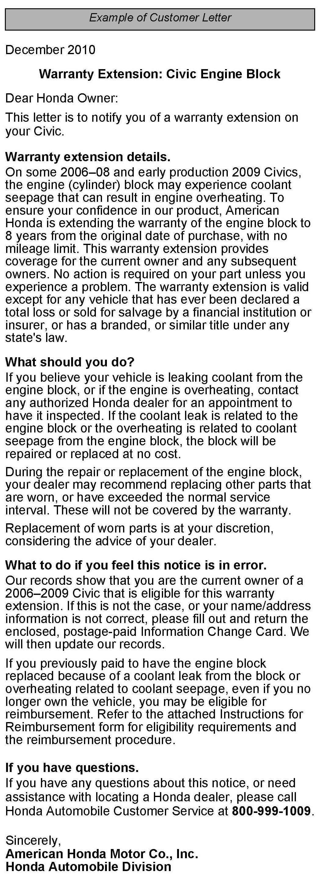 On some 2006-08 and early production 2009 Civics, the engine (cylinder) block may experience engine coolant leaks, resulting in engine overheating. To increase customer confidence, American Honda is extending the warranty of the engine block to 8 years from the original date of purchase, with no mileage limit.