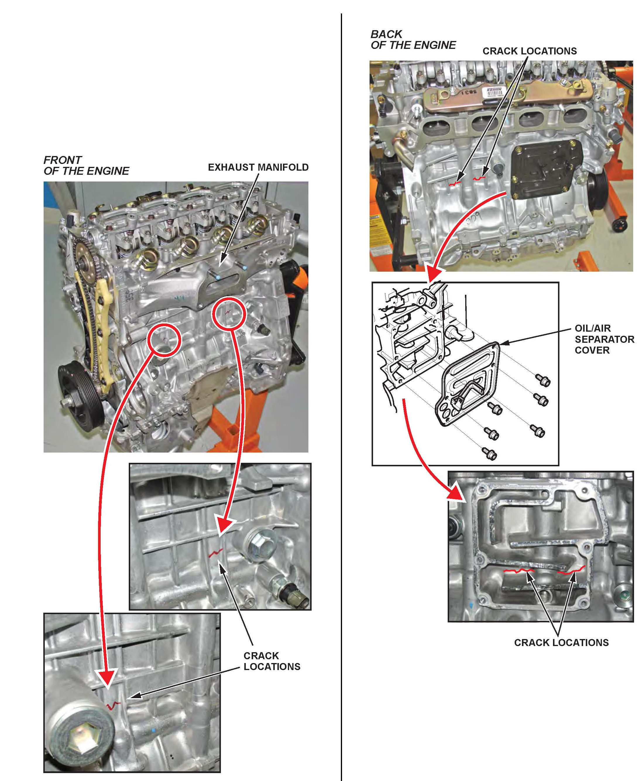 Look for coolant leaking from cracks in the block at the points shown below. On the back side of the engine, remove the oil/air separator cover so you can check beneath it. Pressure4est the cooling system if needed.