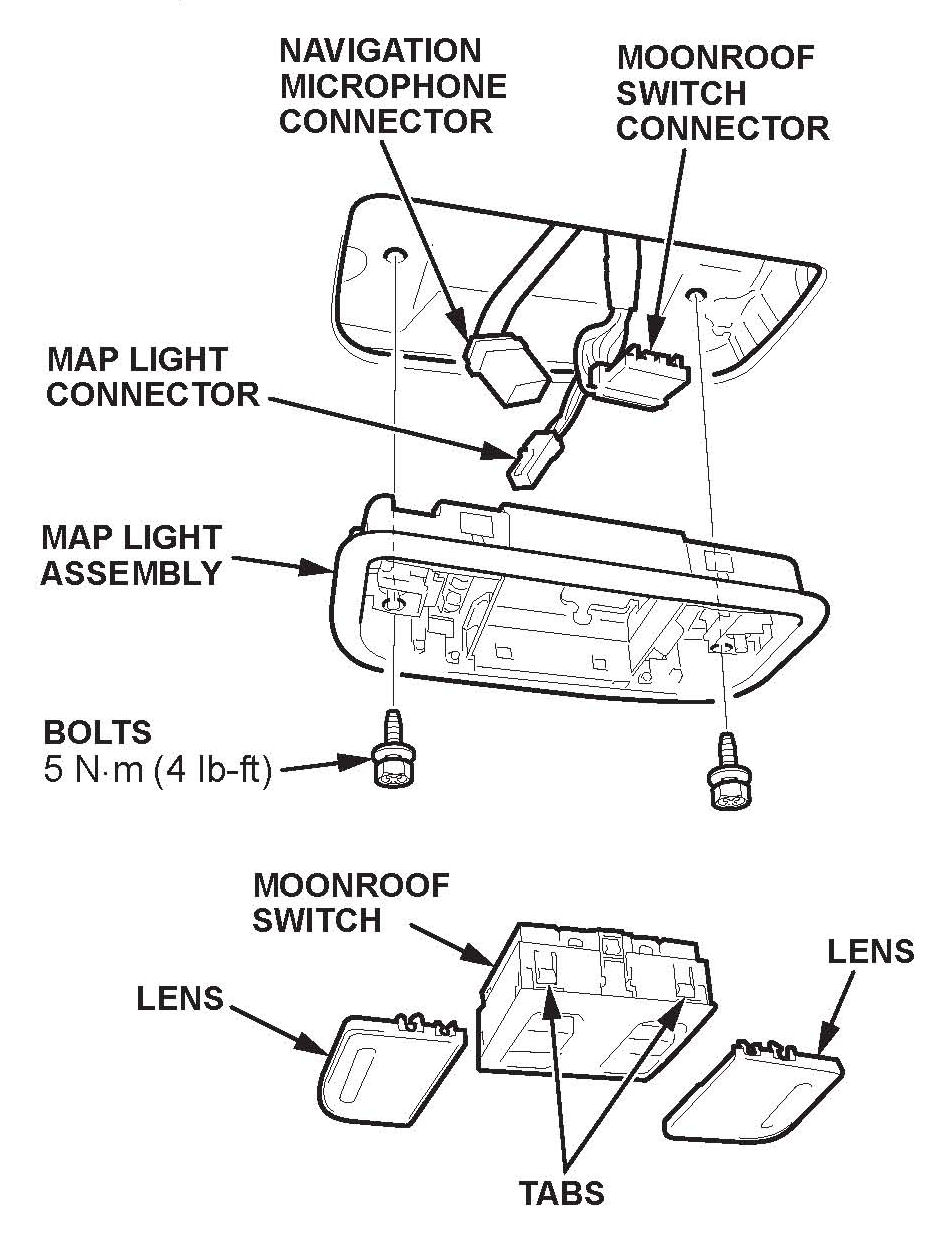^ Disconnect the front individual map light connector. If equipped, disconnect the navigation microphone connector.