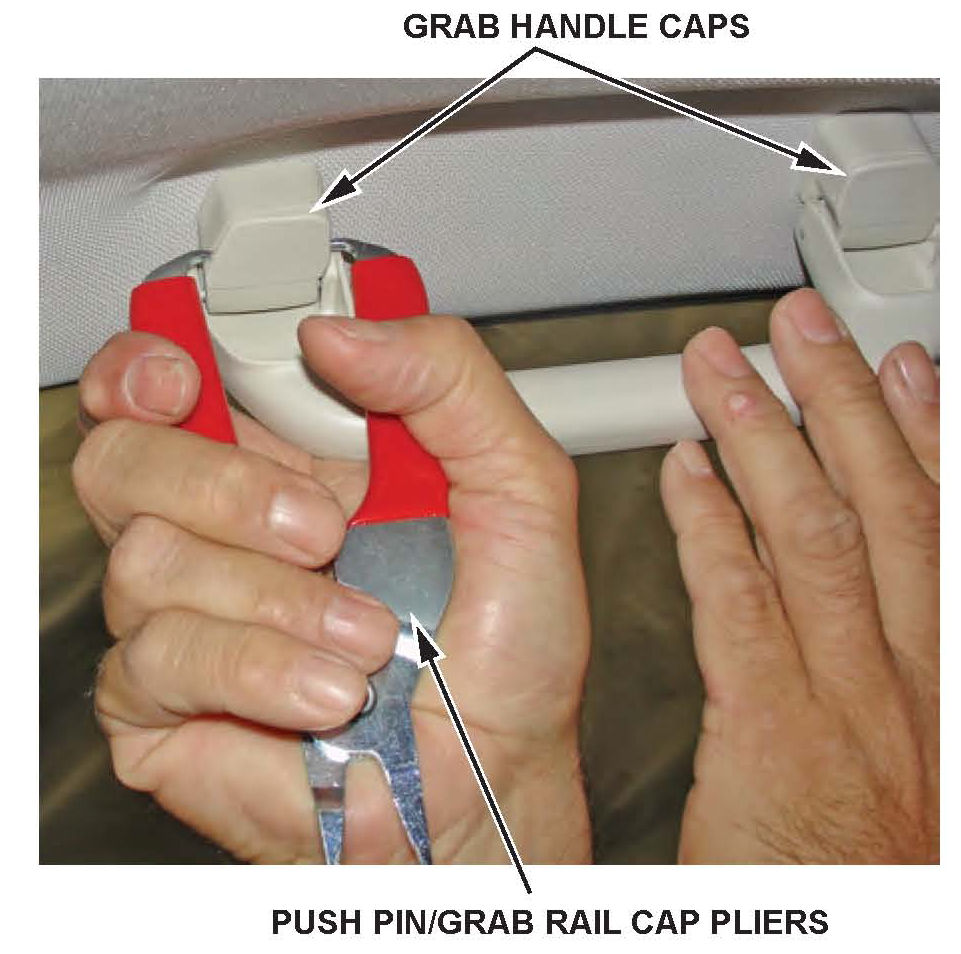 5. Lower the grab handle, then remove the caps with the push pin/grab rail cap pliers.
