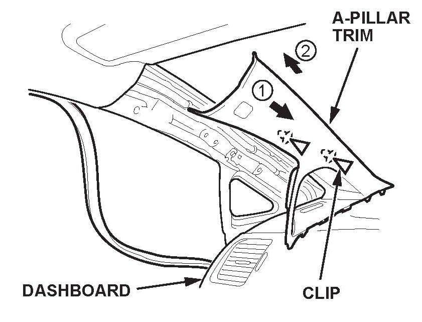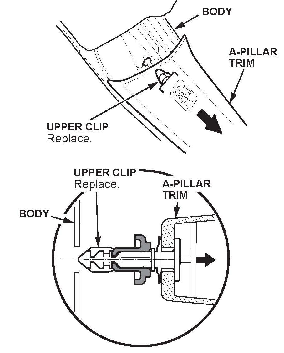 The upper clip must be replaced with a new one when the A-pillar trim is reinstalled.