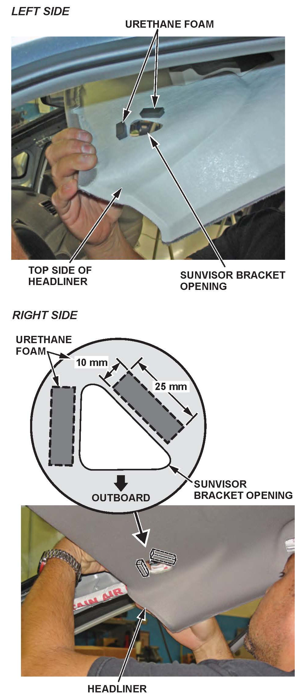 14. On the top of the headliner, attach two pieces of urethane foam near each sunvisor bracket opening as shown.
