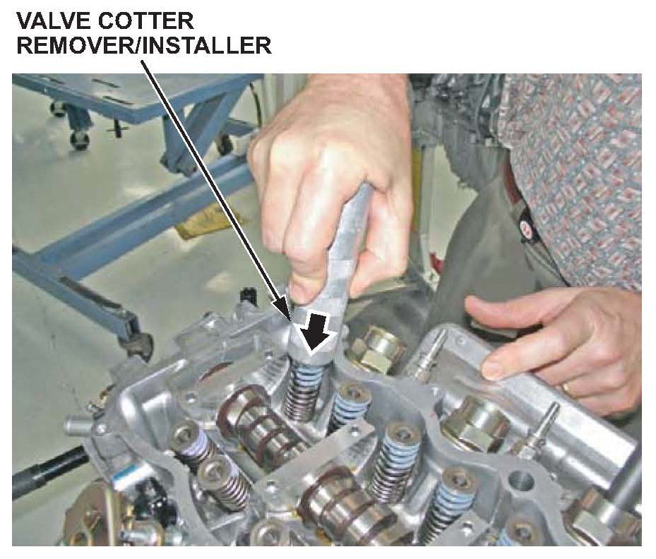 9. Attach the installation adapter to the valve cotter remover/installer tool, and place the end of the tool on top of the affected valve. Push down on the tool to compress the valve spring. When you release the tool, the valve cotters should be reinstalled. If needed, repeat this step until the cotters are reinstalled.