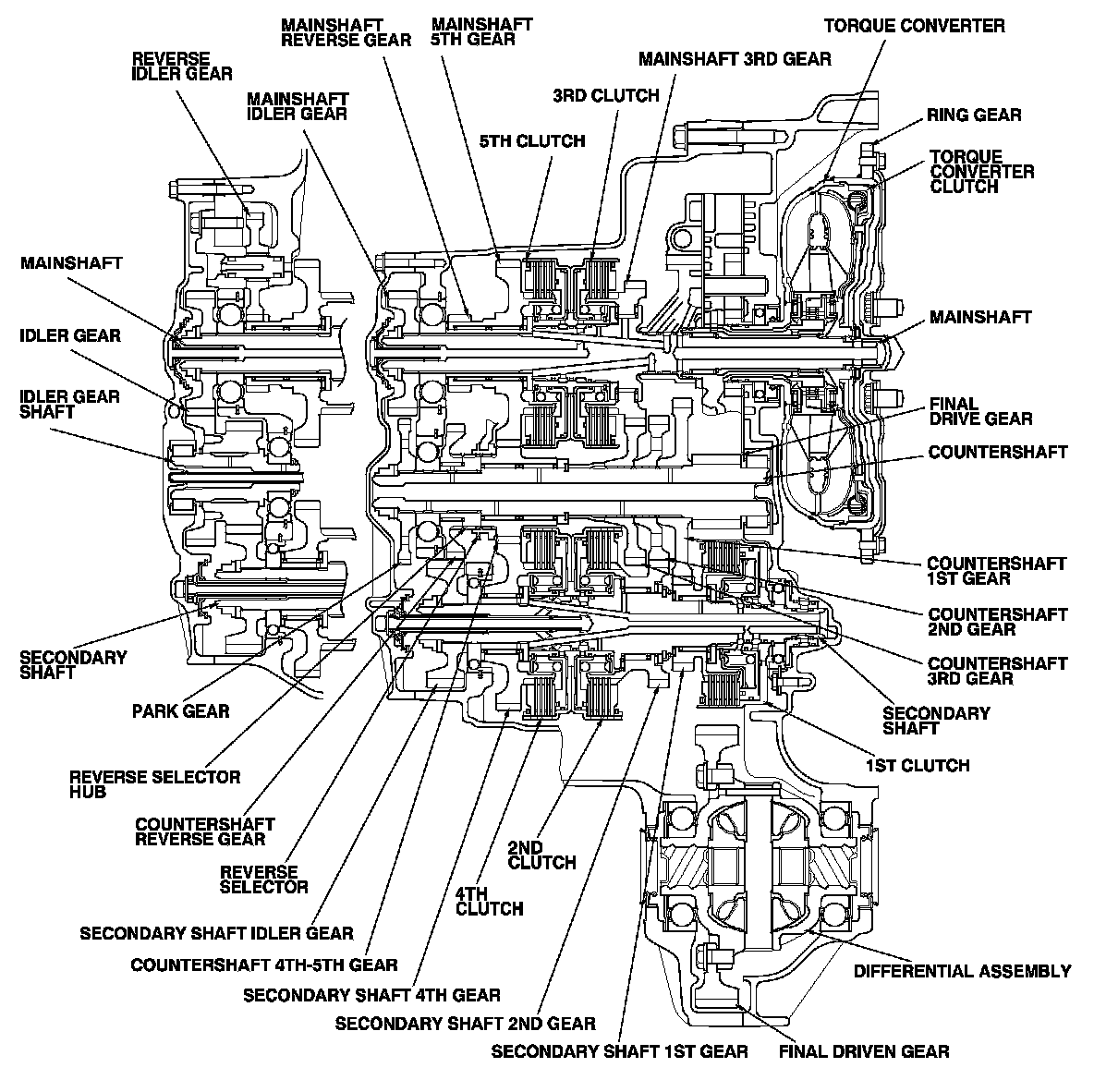 The 1st clutch engages/disengages 1st gear, and is located at the right end of the secondary shaft, opposite the end cover. The 1st clutch is supplied hydraulic pressure by a circuit connected to the internal hydraulic circuit.