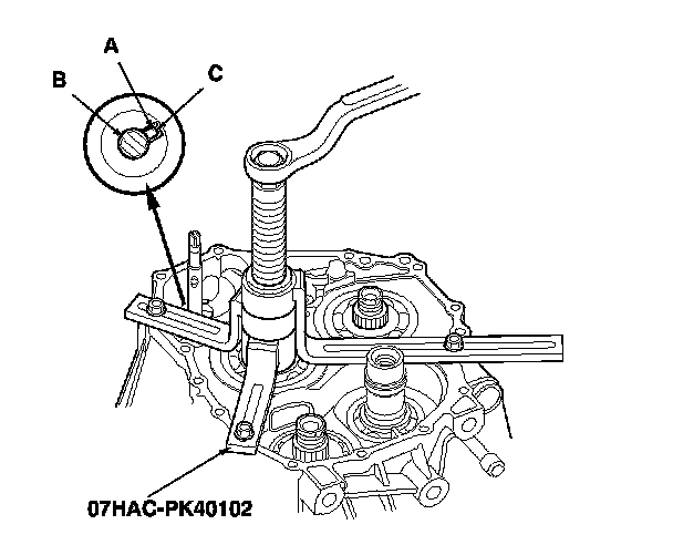 4. Align the spring pin (A) on the selector control shaft (B) with the transmission housing groove (C) by turning the selector control shaft with the detent plate.