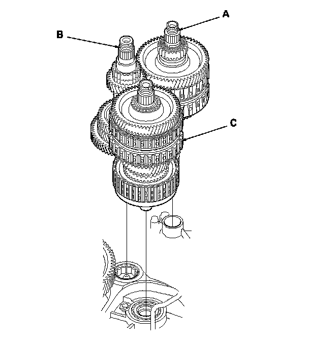 8. Remove the mainshaft subassembly (A), the countershaft subassembly (B), and the secondary shaft subassembly (C) together. If the reverse selector hub is removed by hand, remove the 4th-5th gear and the needle bearings, and remove the mainshaft subassembly. Then remove the countershaft subassembly and the secondary shaft subassembly together.