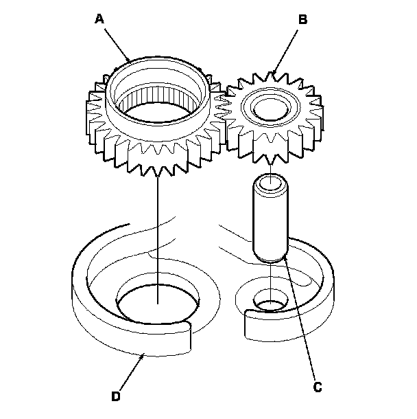 1. Install the ATF pump drive gear (A), the driven gear (B), and the ATF pump driven gear shaft (C) in the main valve body (D). Lubricate all parts with ATF, and install the ATF pump driven gear with its grooved and chamfered side facing up.