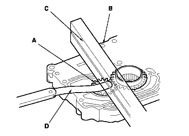 3. Remove the ATF pump driven gear shaft. Measure the thrust clearance between the ATF pump driven gear (A) and the main valve body (B) using a straight edge (C) and a feeler gauge (D).