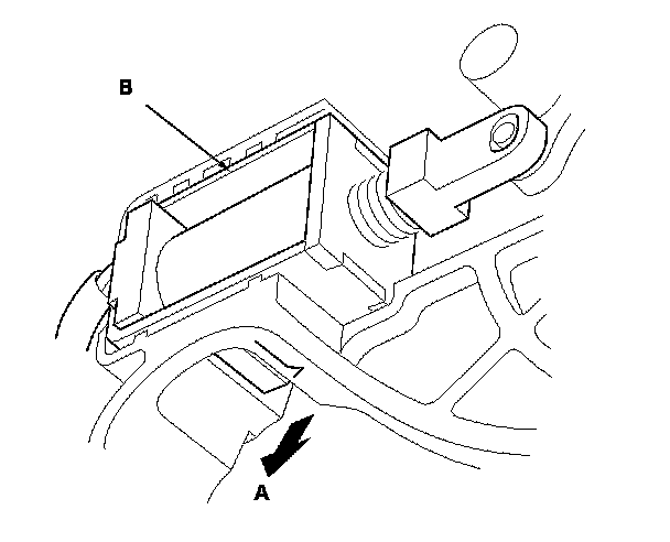 3. Release the shift lock solenoid lock (A), then remove the shift lock solenoid (B).
