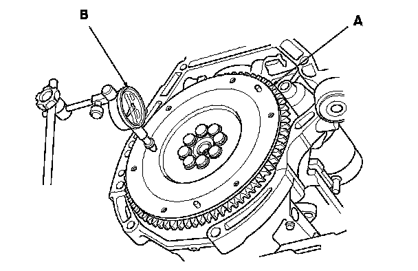 15. Measure the flywheel (A) runout using a dial indicator (B). Through at least two full turns with pushing against the flywheel each time you turn it to take up the crankshaft thrust washer clearance. If the measurement is more than the service limit, replace the flywheel, and recheck the runout; go to step 16.
