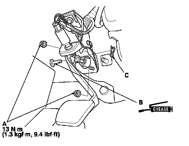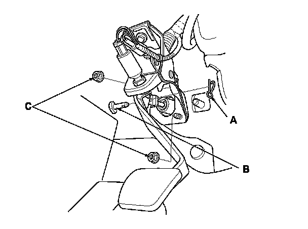 22. Apply multipurpose grease to the clevis pin (B) and the mating surface of the clevis and the pedal. Slide clevis pin into the clevis, then install a lock pin (C).