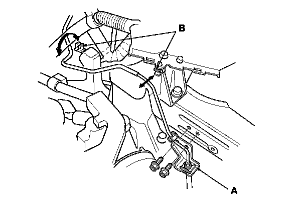 13. Install a new O-ring (A) on the clutch line (B), then install the clutch line in the clutch master cylinder (C) with a new retaining clip (D).