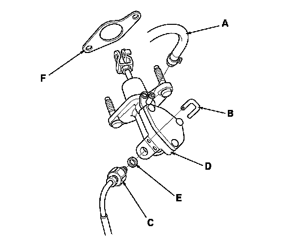12. Remove the O-ring (E) and the clutch master cylinder seal (F) from the clutch master cylinder.