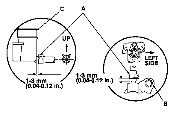 15. Make sure the hose clamps (A) are positioned on the master cylinder (B) and the reservoir (C) as shown.