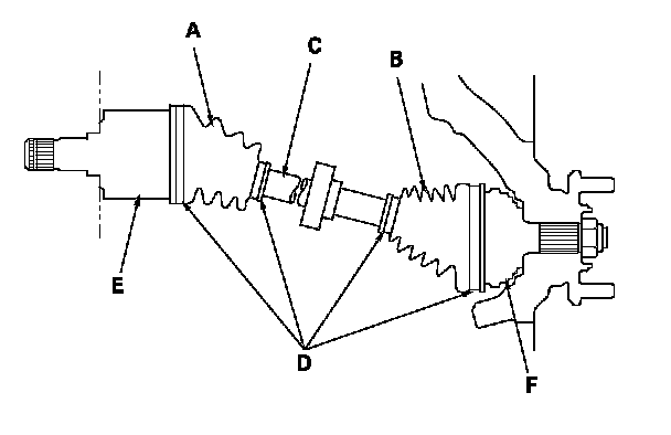 3. Check the inboard joint (E) and the outboard joint (F) for cracks and damage. If any damage is found, replace the inboard joint or the outboard joint as an assembly.