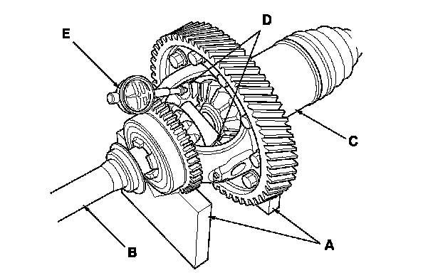 2. Measure the backlash of both pinion gears (D) with a dial indicator (E). If the backlash is not within the standard, replace the differential carrier.