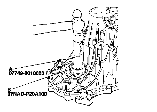 3. Install a new oil seal flush with the transmission housing with the 15 x 135L driver handle (A) and the oil seal driver attachment (B).