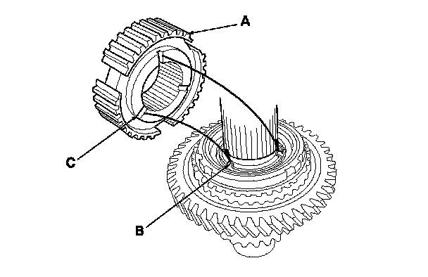 4. Install the 1st/2nd synchro hub (A) by aligning the friction damper fingers (B) with the grooves (C) in the 1st/2nd synchro hub.