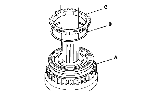 3. Install the friction damper (A), the synchro ring (B), and the synchro spring (C) in 1st gear.