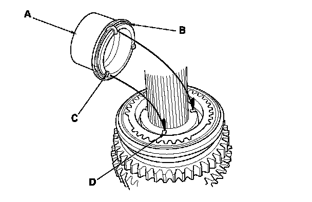 6. Install the distance collar (A) and the friction damper (B) by aligning the friction damper fingers (C) with the grooves (D) in the 1st/2nd synchro hub.
