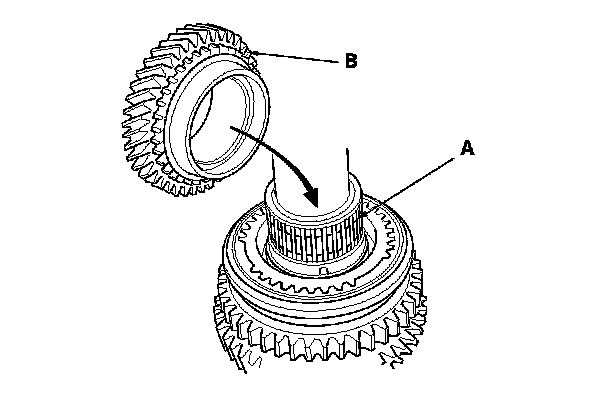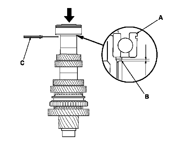 5. Install the reverse gear (A), the synchro spring (B), and the synchro ring (C) onto the countershaft. After installing, check the operation of the 1st/2nd synchro hub set.