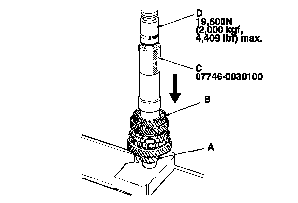 8. Support the countershaft (A) on steel block, then install 3rd gear (B) using the 40 mm inner driver handle (C) and a press (D).