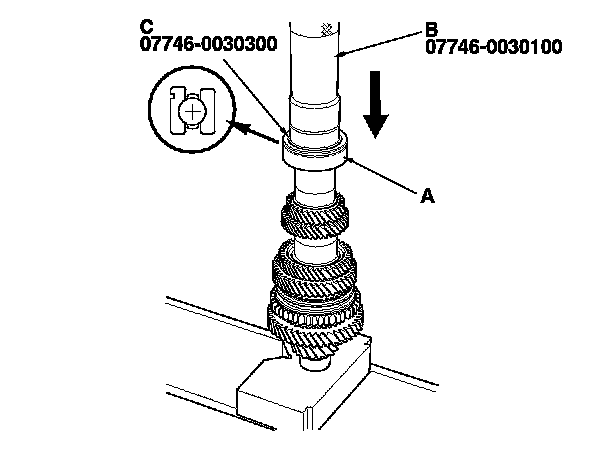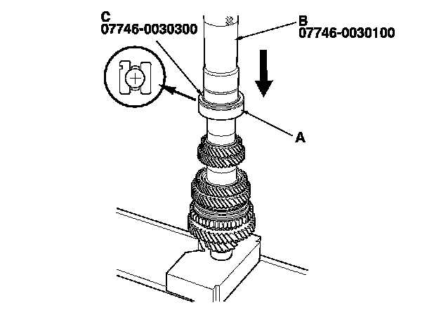 10. Install 5th gear (A) using the 40 mm inner driver handle (B) and a press (C).