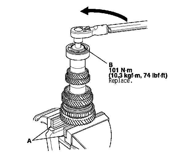 18. Securely clamp the countershaft assembly in a bench vise with wood blocks (A).