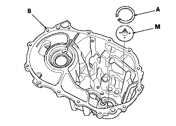 1. Remove the 52 x 62 mm shim (A) and oil guide plate M from the transmission housing (B).