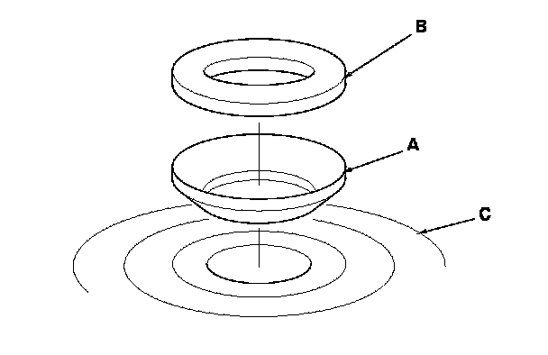 2. Thoroughly clean the 36 mm spring washer (A) and the 26 mm washer (B) before installing them on the clutch housing side ball bearing (C).