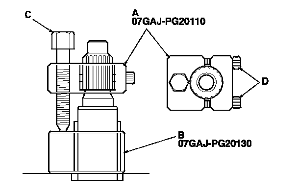 - Backout the catch adapter bolt (C), and loosen the two hex bolts (D).