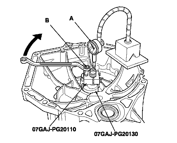 12. Turn the catch adapter bolt (B) clockwise; stop turning when the dial gauge has reached its maximum movement. The reading on the dial gauge is the amount of mainshaft thrust clearance.
