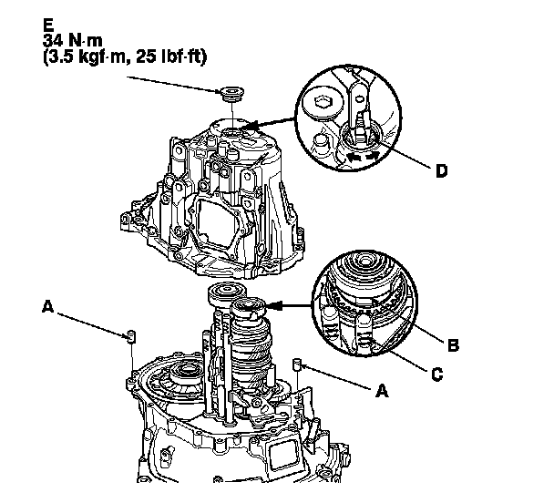 11. While expanding the 69 mm snap ring (D) on the countershaft ball bearing using snap ring pliers, push the transmission housing down to start the countershaft ball bearing through the snap ring.