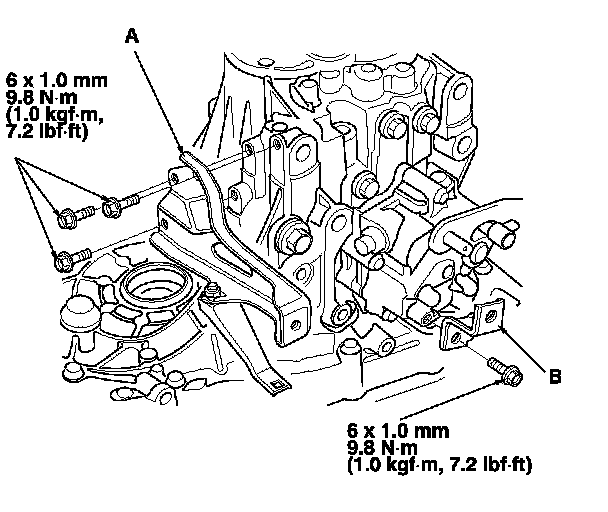 20. Install the steel balls, the springs, and the detent bolts (A) with new washers (B).