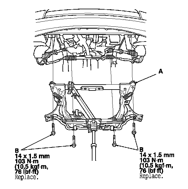 11. Install the front subframe (A). Loosely install new subframe mounting bolts (B).