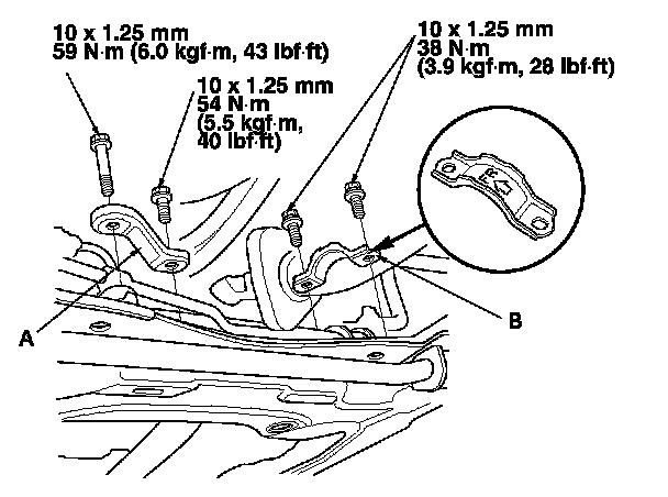 12. Align the front subframe reference marks (A) to the body (B), as noted during removal. Tighten the subframe mounting bolts to the specified torque.