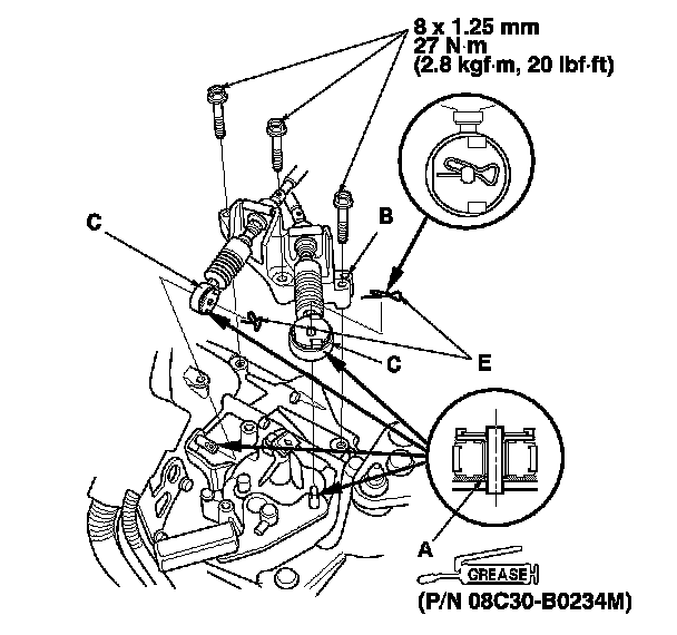 32. Install the shift cable bracket (B) and the shift cables (C), then install new cotter pins (D) or the lock pins (E).