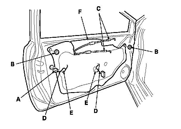 2. Disconnect the power door lock actuator connector (A), and remove the plug caps (B).