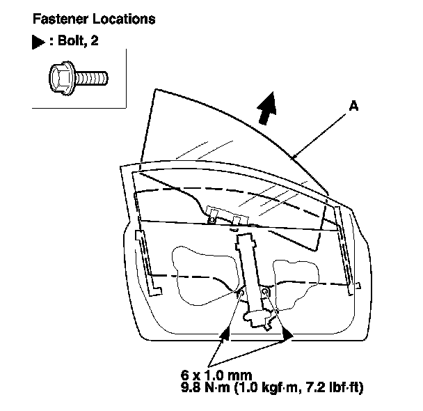4. Carefully raise the glass (A) until you can see the bolts, then remove them. Carefully pull the glass out through the window slot. Take care not to drop the glass inside the door.