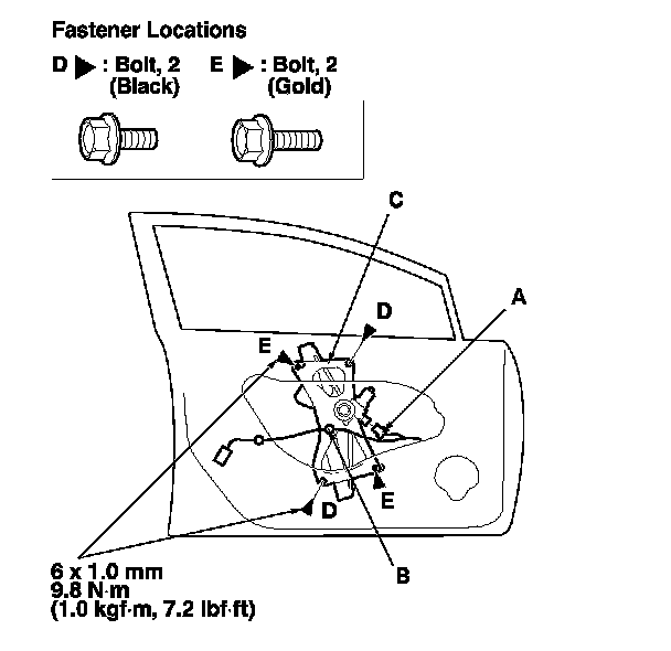 6. Remove the bolts (D), and loosen the bolts (E), then remove the regulator through the hole in the door.
