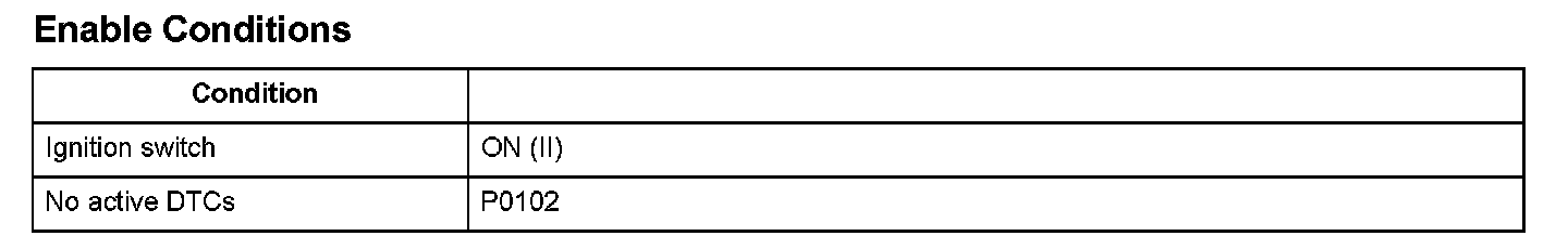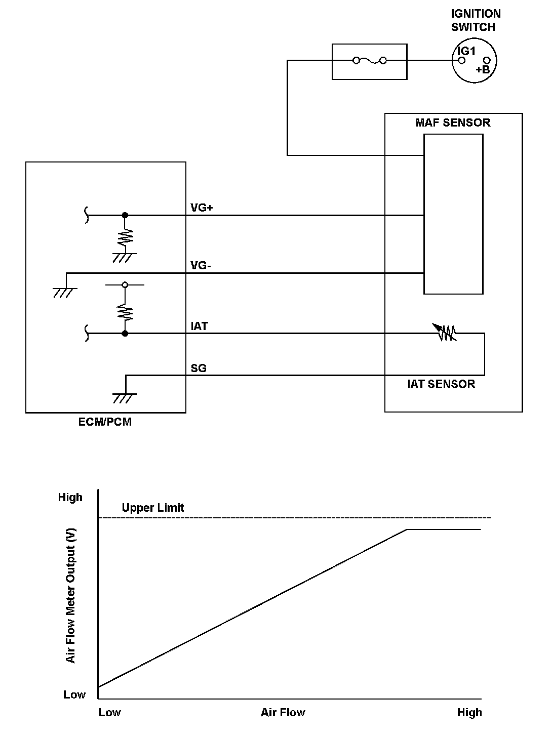 The mass air flow (MAF) sensor is attached to the intake air passage, and it measures the amount of intake air flow. The MAF sensor is a hot wire air flow meter. The air flow cools the electrically heated wire that is mounted in the air passage. The engine control module (ECM)/powertrain control module (PCM) determines the amount of intake air flow by detecting the current that is required to keep the hot wire at a constant temperature. The upper limit of the MAF sensor output is specified. If the output is above that limit, the ECM/PCM detects a malfunction and stores a DTC.