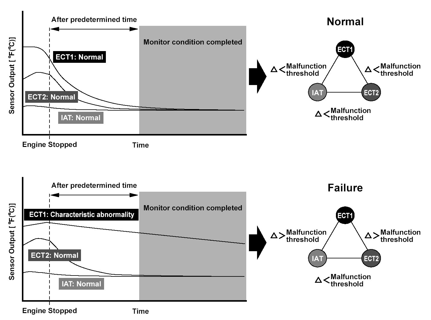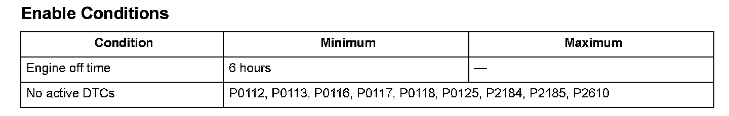 Two engine coolant temperature sensors and one intake air temperature sensor are used by the engine control module (ECM)/powertrain control module (PCM). When the engine is stopped and enough time has passed, the temperature of the engine will equalize to the ambient temperature. When an inappropriate temperature is detected after comparing the temperature readings of each sensor, a malfunction in the corresponding sensor is detected and a DTC is stored.