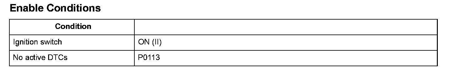 The intake air temperature (IAT) sensor is a thermistor that detects intake air temperature, and it is used for A/F feedback control to compensate for the atmospheric density fluctuations that accompany changes in intake air temperature.The IAT sensor resistance varies depending on temperature. The output voltage and the sensor resistance increase as the intake air temperature decreases. Conversely, the output voltage and the sensor resistance decrease as the intake air temperature increases. If the IAT sensor output voltage is excessively low, the engine control module (ECM)/powertrain control module (PCM) detects a malfunction and a DTC is stored.