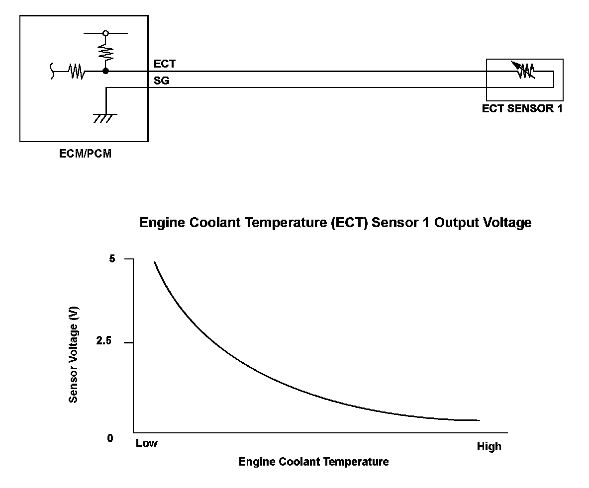 Engine coolant temperature (ECT) sensor 1 is used for air/fuel ratio feedback control, ignition timing control, idle speed control, and other functions. The ECT sensor 1 resistance varies depending on the engine coolant temperature. As the engine coolant cools, the ECT sensor 1 resistance increases, and the engine control module (ECM)/powertrain control module (PCM) detects a high signal voltage. As the engine coolant warms, the ECT sensor 1 resistance decreases, and the ECM/ PCM detects a low signal voltage. If the ECT sensor 1 output voltage is more than a set value when the engine coolant temperature is low, the ECM/PCM detects a malfunction and a DTC is stored.