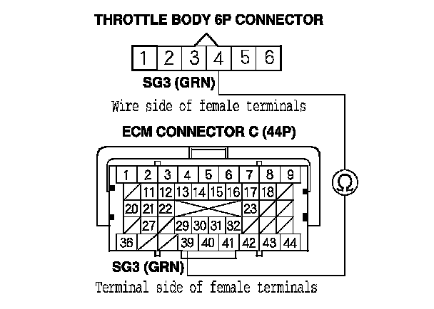 17. Check for continuity between ECM connector terminal C39 and throttle body 6P connector terminal No. 4.