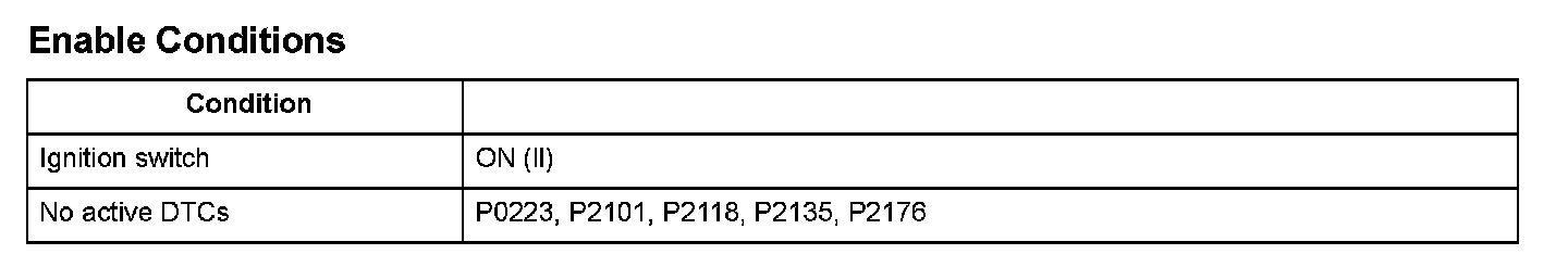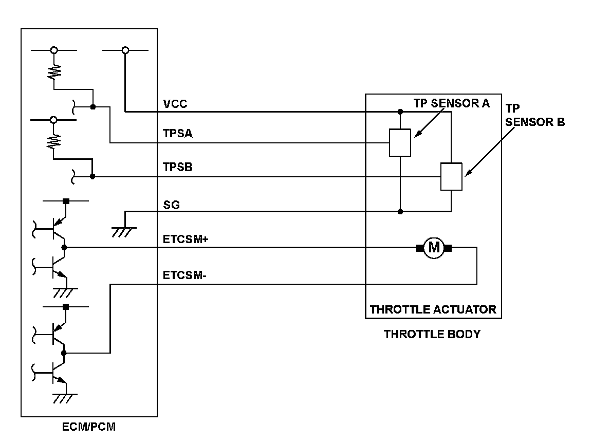 The electronic throttle control system (ETCS) controls the throttle valve opening. The system is composed of the throttle actuator, the throttle valve, throttle position (TP) sensors A and B, the accelerator pedal position (APP) sensor, and the engine control module (ECM)/powertrain control module (PCM). Throttle position (TP) sensor B is a semiconductor type, and it is attached to the throttle body and shaft to determine throttle valve position. The throttle valve position signal from TP sensor B is transmitted to the ECM/PCM for target position feedback control. If the signal from TP sensor B is less than a fixed value for a set time, the ECM/PCM detects a TP sensor B malfunction and stores a DTC.