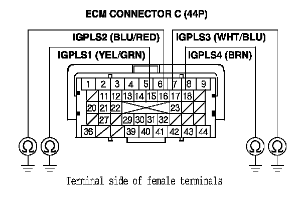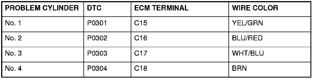 37. Check for continuity between body ground and the appropriate ECM connector terminal of the problem cylinder (see table).