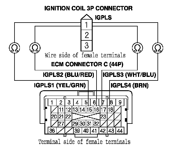 38. Check for continuity between appropriate ignition coil 3P connector terminal No. 1 and the appropriate ECM connector terminal of the problem cylinder (see table).