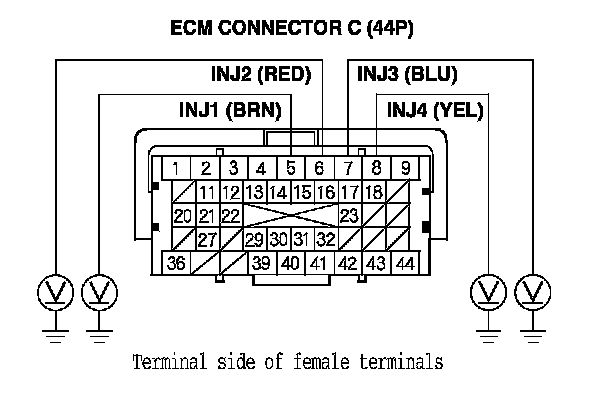 46. Measure the voltage between body ground and the appropriate ECM connector terminal of the problem cylinder (see table).