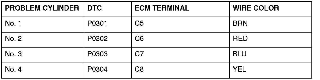 52. Check for continuity between body ground and the appropriate ECM connector terminal of the problem cylinder (see table).